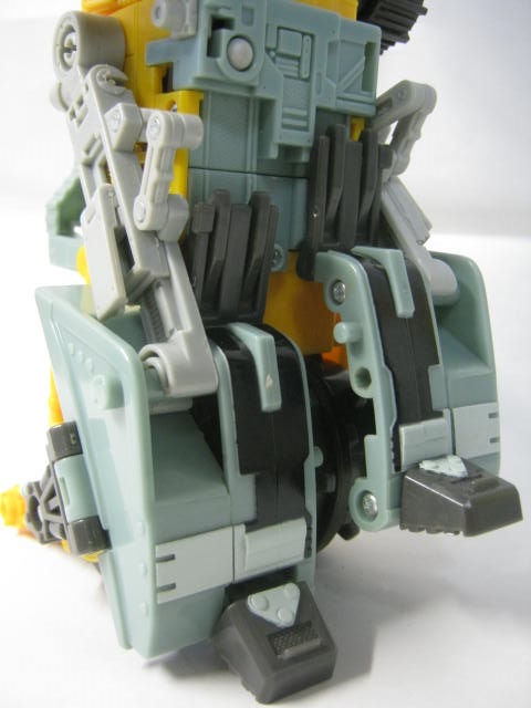 ロボットモードキャタピラに指を生やしてそのまま腕にしたり、ローラーの付いた箱にバケットが変形した脚になるという大胆な姿。前から見ると脚がある様に見えますが、後ろから見ると脚型のカバーを被せているだけなのが伝わるかと。スターコンボイとかダイアトラスに近いモノがあるような。大胆な配置と同時に手足のパワフルさも魅力的。大きな指もパワータイプであることを強調していていい感じ。ミニコンくらいなら持てるかも。