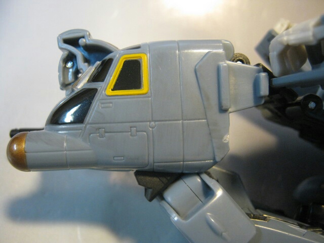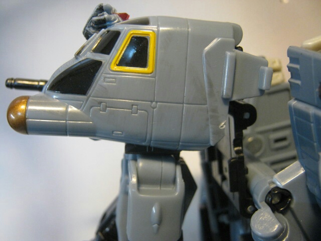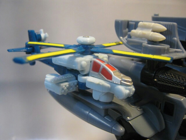背中のパーツを纏めて外し、メインローターを展開した後に基部を90度倒して肩のジョイントに装備すると武器に。ビークルモード同様、レバーを押せば回転します。当然、重心が片寄るので倒れやすくなるぞ!