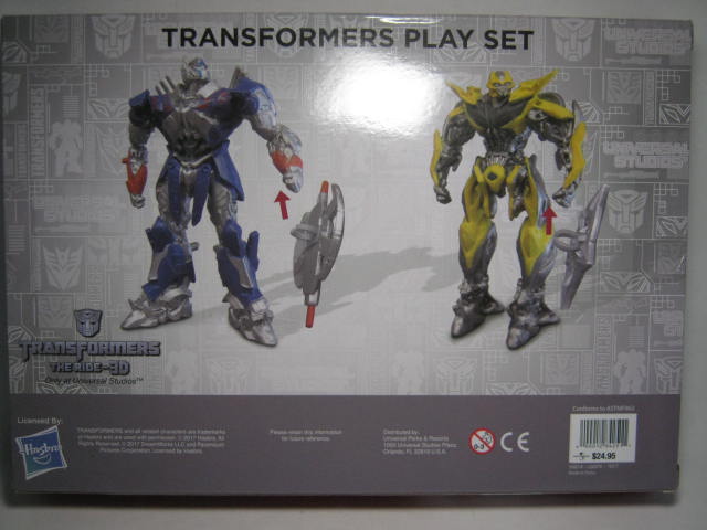 パッケージ3体のフィギュアが見えるウィンドウボックス型。えー早速ですがツッコミポイント。ユニバーサルスタジオの限定品らしくイーバックがパッケージに印刷されているのですが、このセットにはイーバックは付属しません。その上、ザ・ライドにも登場するオプティマスとビーはアトラクションとはデザインの違うロストエイジ版のデザイン。スティンガーも付属するにパッケージ裏では記載なし。謎だ。ちなみに現地で約25ドルとそこそこしました。