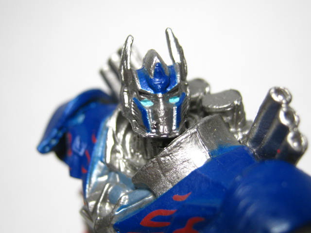 オプティマスプライム早速なんですが、顔が明後日の方向を向いています。造型自体はそこそこ細かいのですが、柔軟樹脂製というのもあってかモールドはややヌルめ。細かい塗装は省略されていますが、胸のファイヤーパターンとかはあってまぁまぁ良い方だと思います。