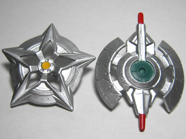 武器2種類。バンブルビーのスピニングブレードを模したモノとオプティマスのベクターシールド風のモノ。裏面がクリップ状になっているのでそこに挟み込む形で保持させます。