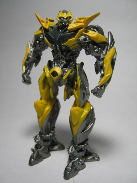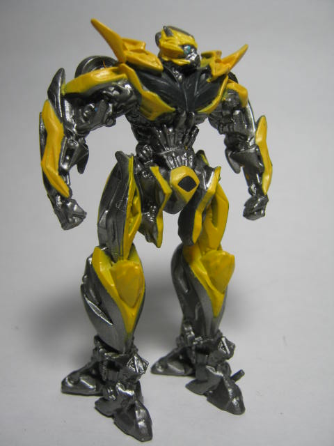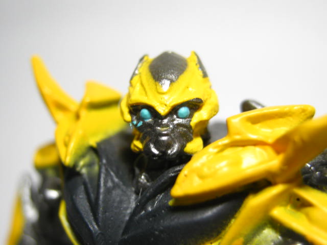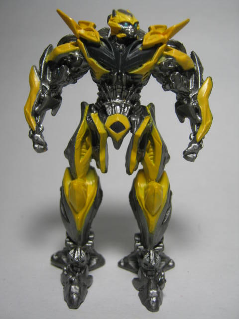 バンブルビーこちらも何故か横を向いています。オプティマス程の角度ではありませんが。ハズブロがロストエイジ期に使用していたCGアートで似たようなポーズを取っていたので、それが元になっているのかも知れません。ちょっと下半身が黄色すぎる様な。