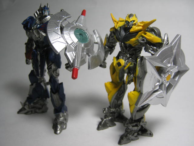 装備!ややオーバースケール気味。剣では無く盾のみ装備するオプティマスというのも珍しい。ビーの武器はコンセプトアート等で装備していましたね。