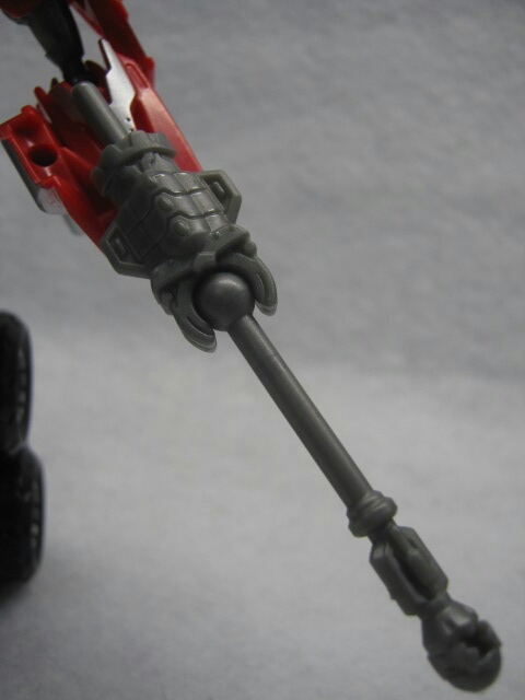 付属の武器を左右に取り付けられます。タイヤの取り付けピンがやたら目立つのが残念。タイヤの穴も妙にデカくてやけに目立ちます。先端のトゲトゲはアニメには無いオリジナル仕様の模様。