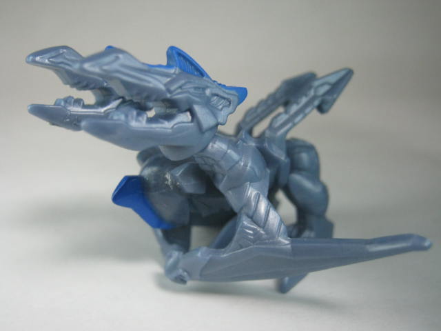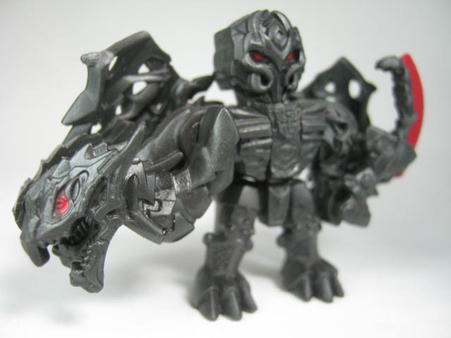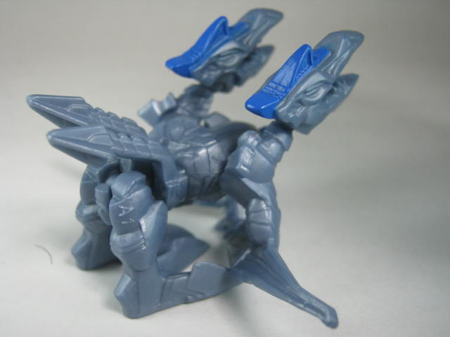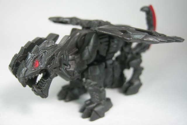 黒い3つの頭を持つドラゴンに変形。翼のモールドが細かく、小さく穴まで開いているのが凄い。真ん中の頭が左右の頭に隠れがちなのが残念。ちなみに左右の頭部は片面しか造型されていません。右面から見ると腹周りにロボットモードの顔が見えてしまうのは気にしない。