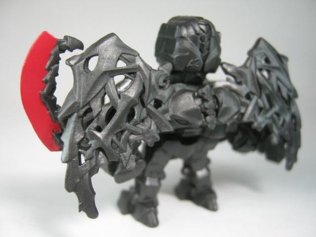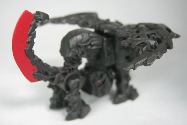 クインテッサを裏切り、杖を奪い地球に潜伏していた騎士達が合体した戦士。黒いボディや各部のデザインから、2体合体するリーダークラス版では無くリージョンクラスやターボチェンジシリーズ等の単体変形版のデザインの様です。翼をや脚等、中央に軸を置かないで変形させるのが面白い。改めて見ると凄い禍々しい見た目してますね・・・。尾をそのまま剣を持った腕に見立てたりしているので両腕がちょっと不自然な形状になってしまいました。