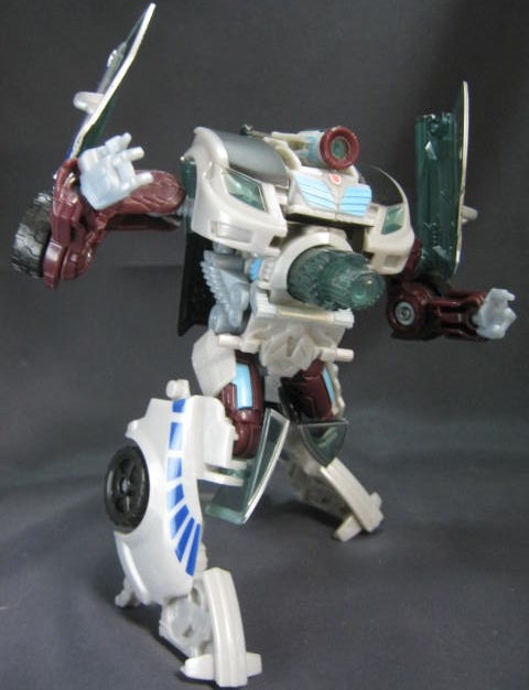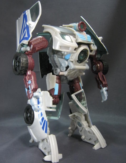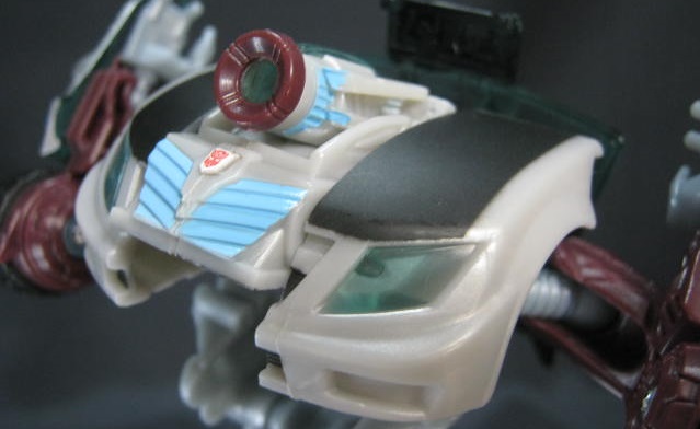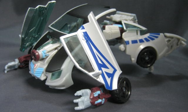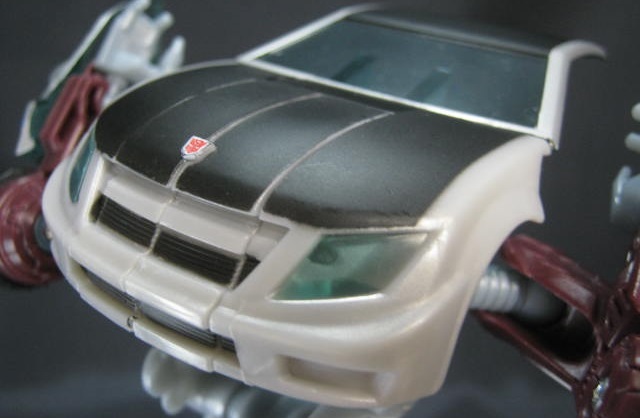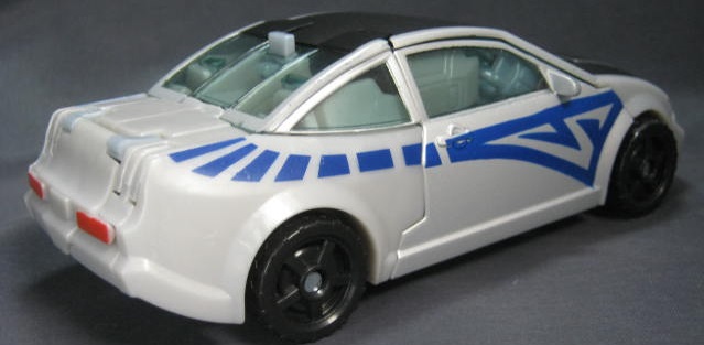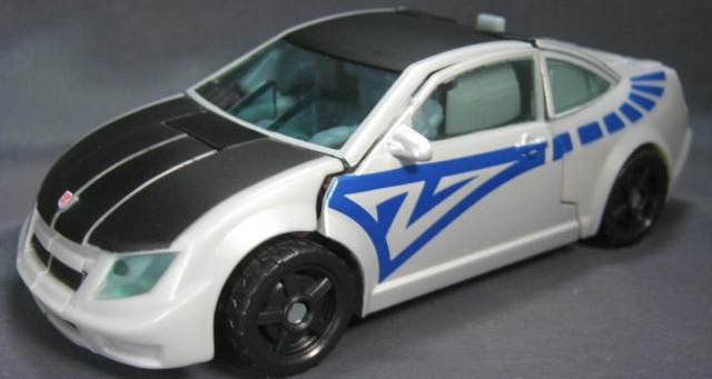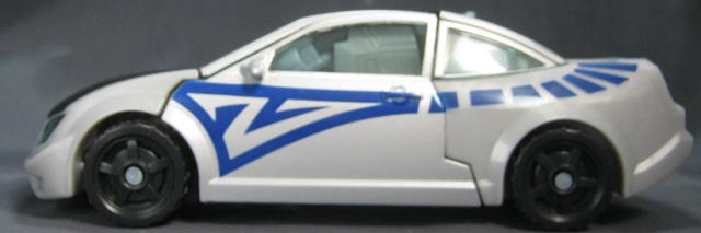 ビークルモードシボレー・コバルト風のオリジナルデザインの車に変形。上部の艶消しブラックの塗装と側面の青い模様が特徴的。青いラインを除けば、ごく普通の街中で見る車っぽい感じ。特徴的な車が多いTFの中では程よくモブっぽい車は珍しい。