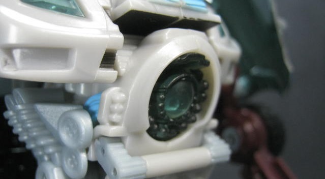 フェイスアップカメラ状の顔。ディセプティコンの量産型ドローン系が共通してこの見た目なので、ちょっと弱そう。カメラ部分がデカいのと、頭部が埋もれ気味なので、顔が良く見えない。集光ギミックで光りますが、クリアパーツの色が暗めなのであんまり綺麗じゃない。