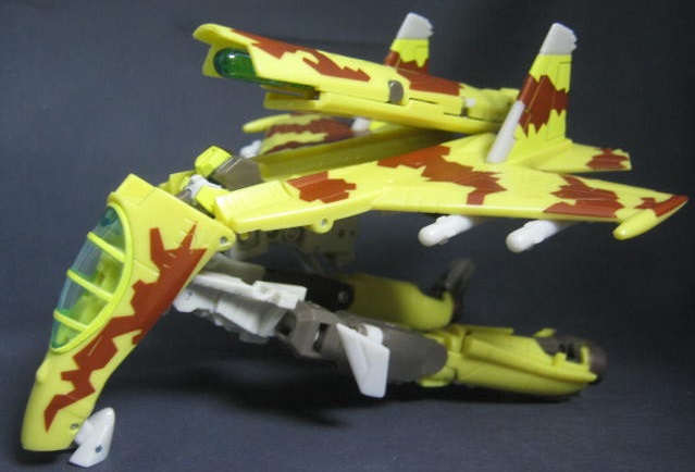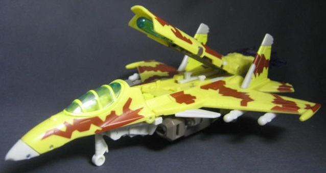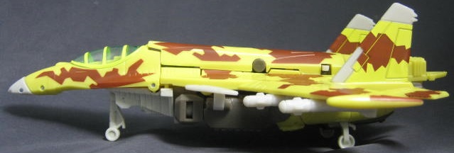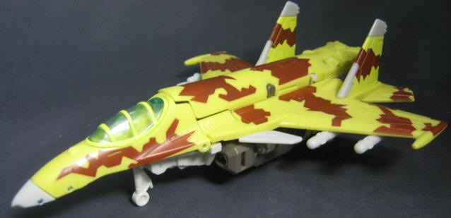 ロシアの開発した戦闘機であるSU-37風のビークルモード。オールスパークパワーシリーズで発売された同時期の製品の多くは元々ユニバース2.0用というのもあり、特定のキャラをイメージしたリカラーでしたが、ダイブボムに関しては特に元ネタとなるキャラクターがいないハズ。ただしビークルモードのペイントは、SU-37に実際に使用されている迷彩を意識してる模様。