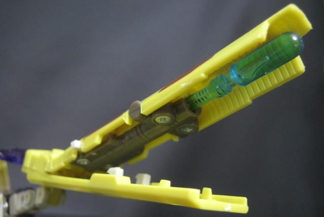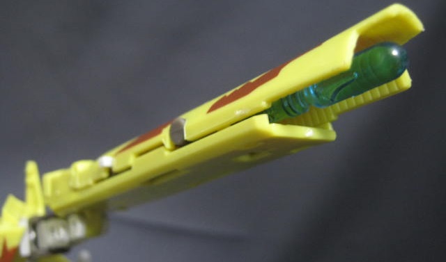 ビークルモードでセットすると中央部パネルが起き上がり、左腕であるキャノンが露出。ビークルモードでミサイルを発射することができます。