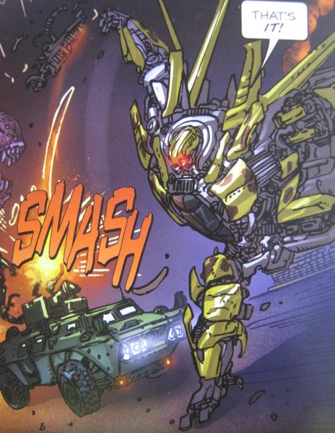 1作目の後日譚である「レイン・オブ・スタースクリーム」では、生き残ったスタースクリームによるディセプティコンの統治へ不満を持ち、反乱を起こしたドレッドウィング側のメンバーの一人として登場。玩具オリジナルキャラでも比較的、玩具に近い見た目で登場するコミック版にしては珍しく、大幅に異なる外見。どちら様ですか?