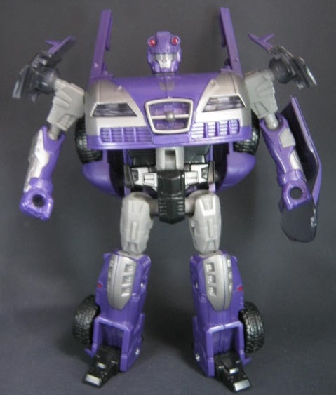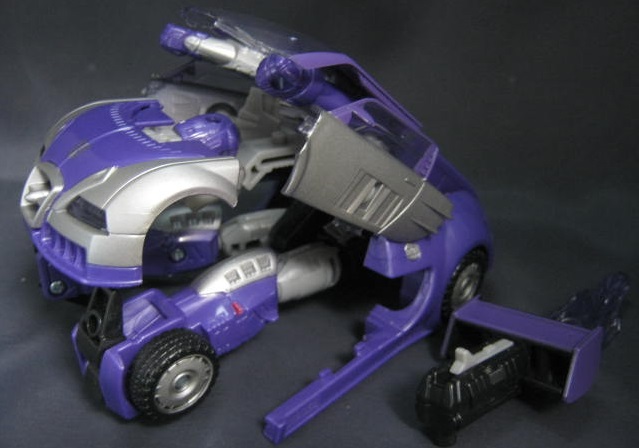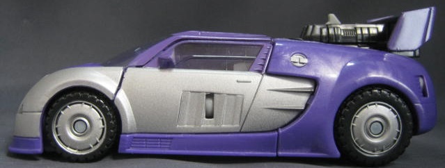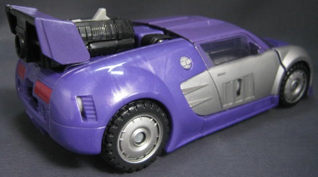 ビークルモードブガッティ ヴェイロンを意識した紫のスポーツカーに変形。ドリフトよりも先にとんでもない値段の高級車のブガッティが実写デビューです。こちらはあくまでもブガッティ風な上に他シリーズの玩具を流用したオリジナルキャラですが。