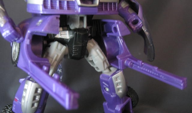 ロボットモードボンネットを配置した胸など、一見オーソドックスな車型TFの見た目ではありますが、肩のドアやシールドとして装備されたルーフなど、独自の要素があるのが面白い。