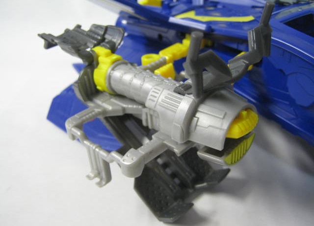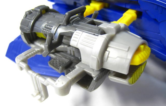 後ろ中央にある黄色いレバーを引くことで変形!!左右のエンジン部分がアームで斜めに展開し、コックピット下のユニットが回転して前後が入れ替わります。この下のユニット、微妙にギアがずれているのか綺麗に180度は回転しないんですよね・・・。その後、両サイドのエンジンのグリップを起こしたりして砲台に変形させることで変形完了。