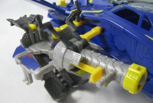 他のサイバーバース商品と連動!左右の砲台にリージョンクラスのTFを載せたり、先端のクローで捕えたり他のビークルと連結したり。左右の砲台はコマンダークラスのことも考えてか上下にグリップがありますが、右の砲台はうまく座らせられないのもあり、スカイクローは基本的にリージョンクラス向きの仕様な印象です。あと手持ち武器を装備出来る3ミリジョイント穴はいくつかありますが、5ミリジョイントはありません。