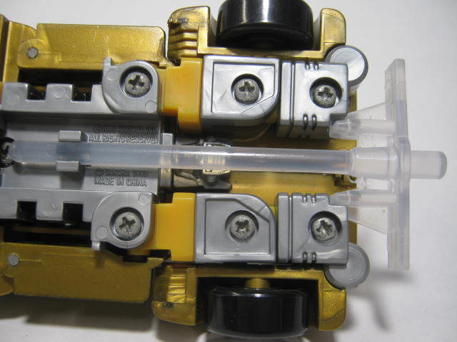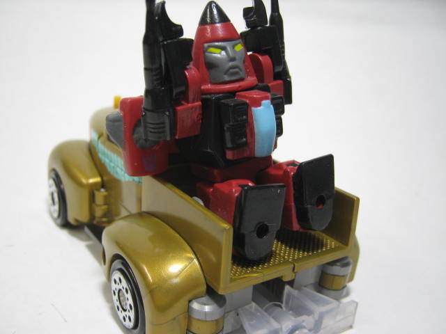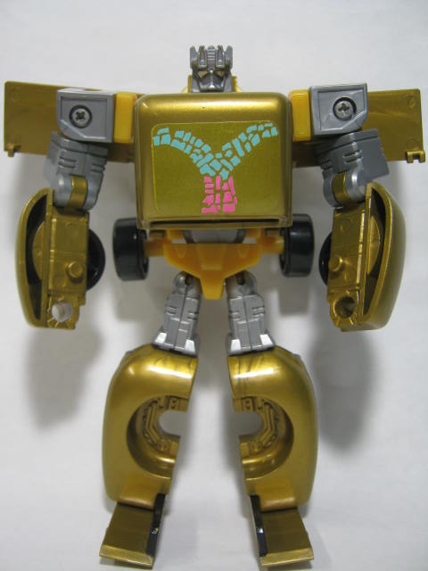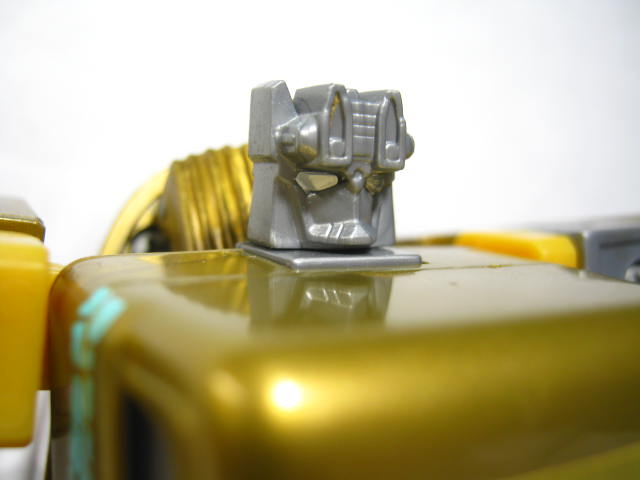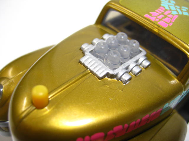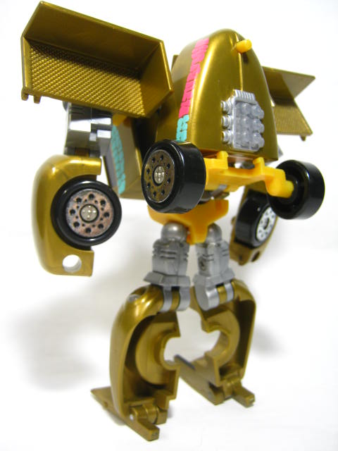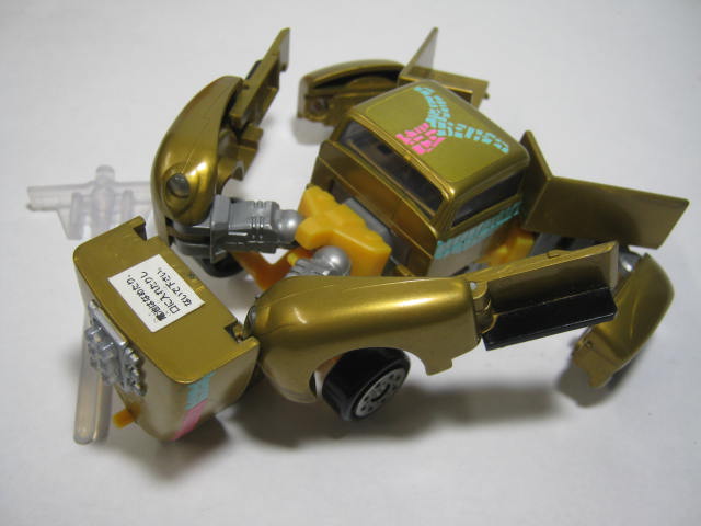 トランスフォーム!結構面白い変形をしており、フロント~側面が脚になり後部は腕に。ボンネットはアームでそのまま背中まで移動します。運転席部分がスライドして縮むのがお気に入り。しかし、その面白い変形ギミックでありながらエフェクトロに使われている金色のプラスチック(通称金プラ)は経年劣化が激しく、非常に脆くなりやすい素材でして、うっかりすると砕けてしまいます。なので弄る際はヒヤヒヤしながら遊ぶハメに。オマケにプレート状のパーツも多く、かなり気を使います。
