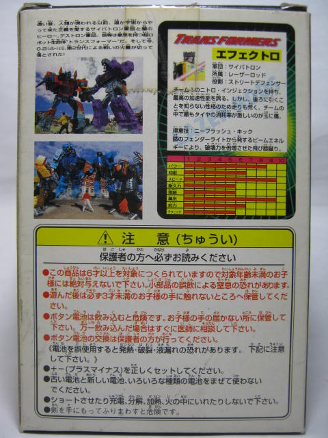 パッケージ長方形のパッケージ。国内版G2製品は殆どの商品がロボットモードで梱包されているのも特徴の一つ。エフェクトロの肩は長いため、怒り肩っぽいポーズで梱包されています。