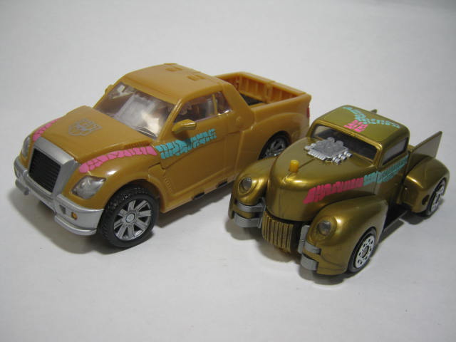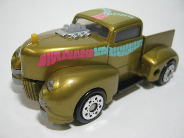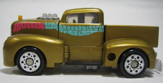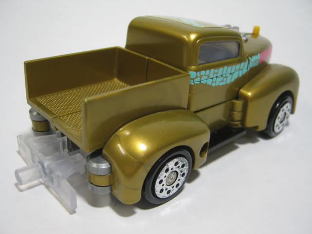 ビークルモード金色のクラシックなピックアップトラックに変形。全体的に丸みを帯びていて可愛らしい。ピンクと水色のペイントもその可愛らしさを上げているような。ヘッドライトがちゃんとクリアパーツになっているのがいいですねぇ。