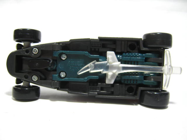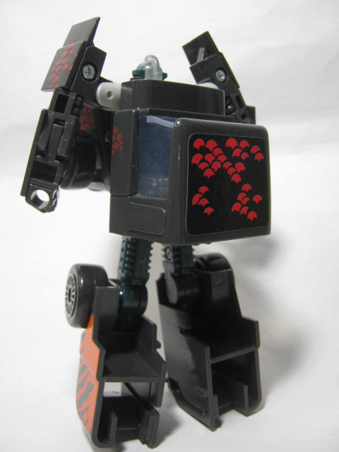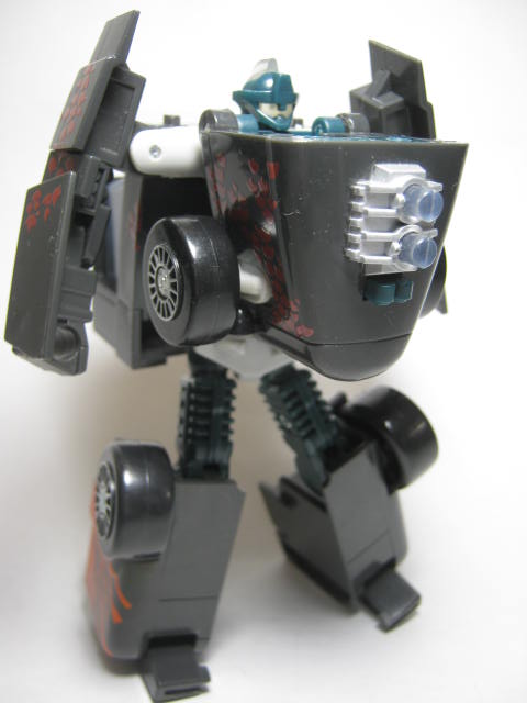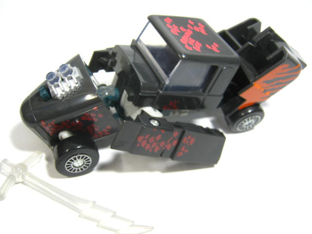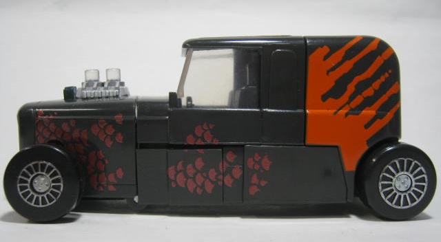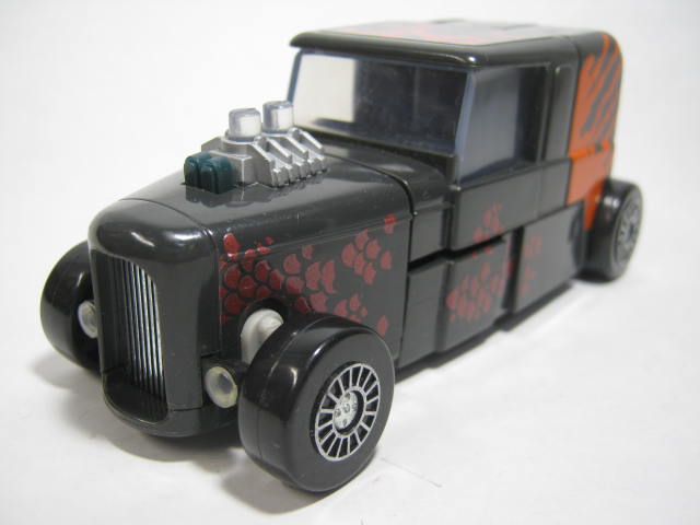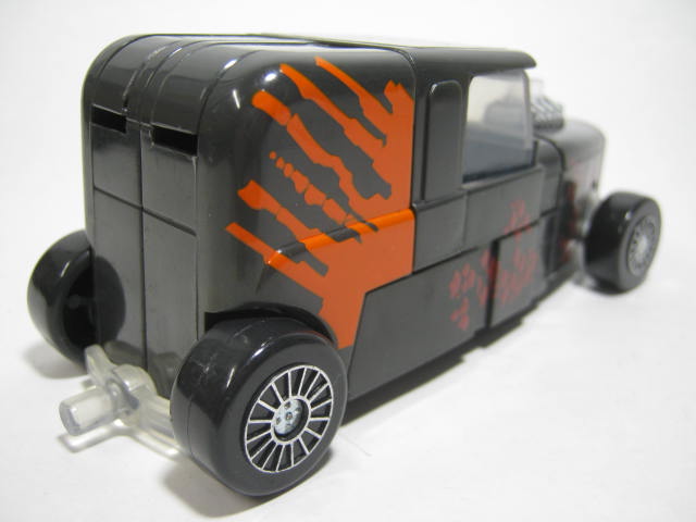 ビークルモード黒いクラシックカーに変形。ファイアボットという名前なのに、特に炎を連想させる要素はありません。ツルリとしたフォルムが素敵。
