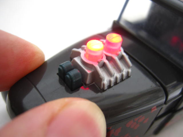 エンジンの発光ギミック。エンジン先端のスイッチか、前輪を押し付けると発光!今回はちゃんと電飾が生きていたので発光します!ファイアボットの発光箇所は小さいので、その分かなり綺麗に光ります。