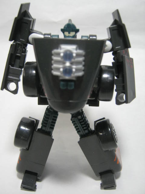 ロボットモード黒とダークグリーンでかなり落ち着いた色合いフロントパーツがそのまま胸に来てる為、厚みがあります。例によって腰がOリングでの固定なのですが、私が所持するモノは腰がやや緩くてちょっと心配。大きなビークル後部が脚に来ている為、G2初期にしては比較的、立たせやすいです。