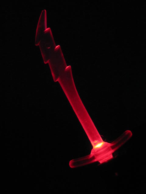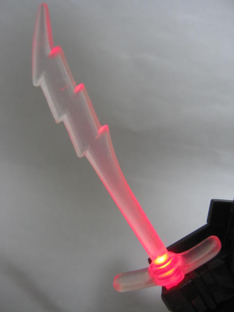 エンジンからコードを伸ばし、拳に装着してスイッチを押せば発光ギミックが発動。稲妻なのに赤いってのも何だか変な感じではある。