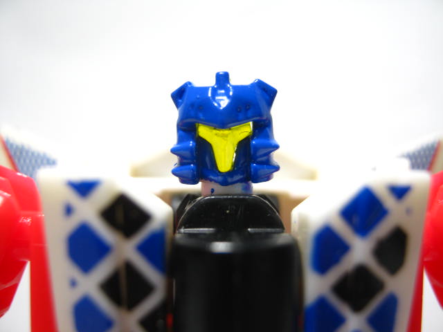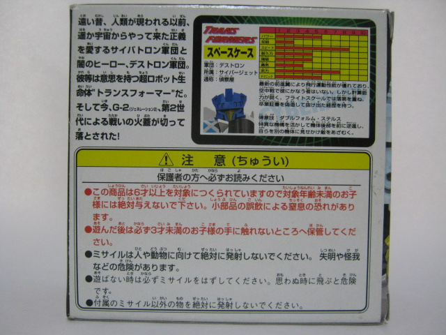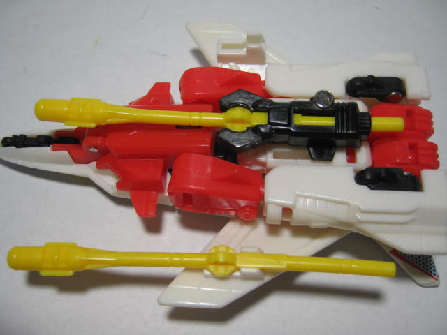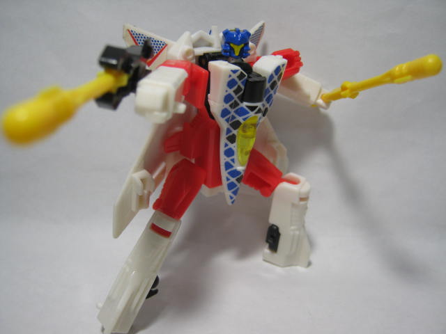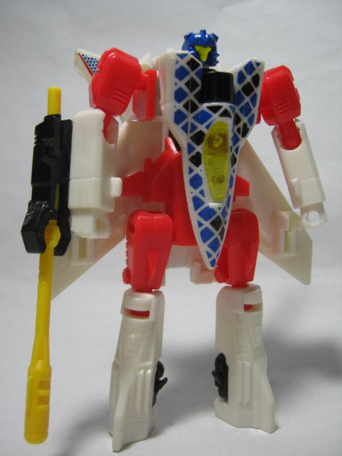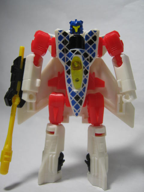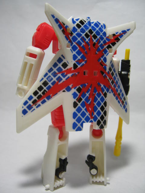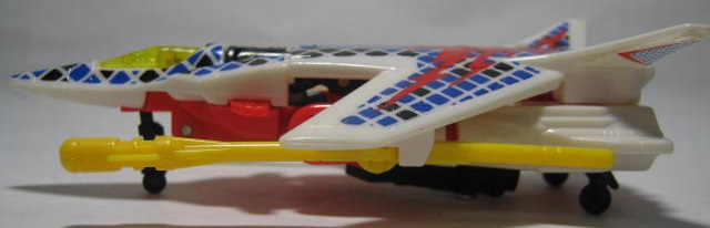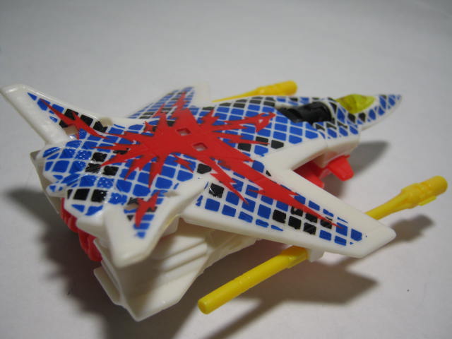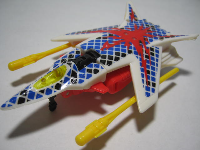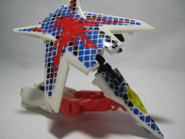 ビークルモード前進翼が特徴的。カラーリング自体はヒロイックですが所属はデストロン。なんかすごい模様。翼を広げた鳥のような絵とチェック模様のペイントが強烈。戦場で目立つ事間違いなし!得意技の