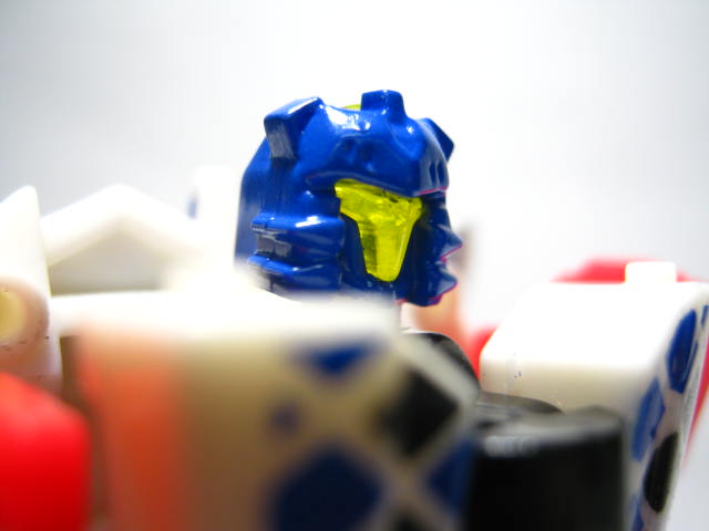 フェイスアップ青く塗装された頭部とクリアイエローのY字状のバイザー。べっとり塗装されているのか、ややモールドが埋まっています。首の軸がちょっと長いのか頭が少し浮いている様にも見える。そして軸にまで塗装が飛んでいる。