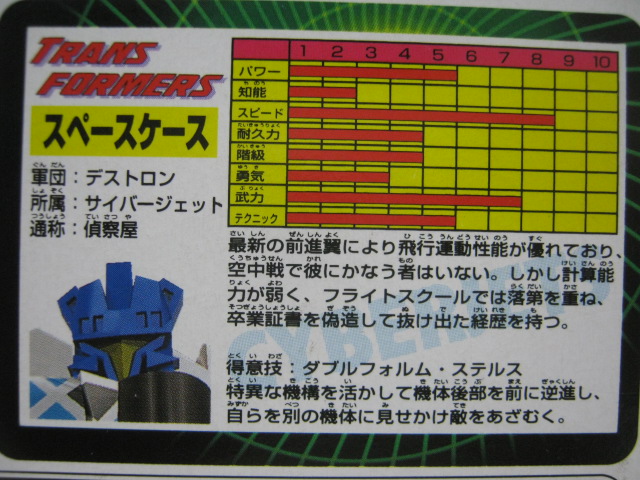 テックスペック計算能力が弱い事からか、知能が低めになっていますね。こういう、設定とスペックがちゃんと一致しているのはなんか嬉しい。しかし、TFにもフライトスクールがあるとは。となると地上ビークルの変形するTFの為の教習所もあるのかな?