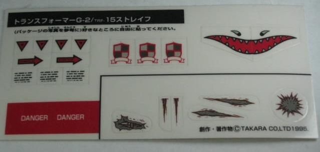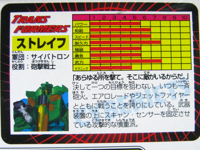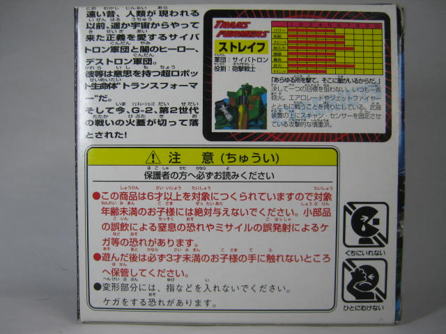 得意技やミサイル名の項目などが無くなってしまったのは他後期製品と同様。その代わり、説明書裏の漫画の説明文がキャラ後とに変えられており、ストレイフのモノには一度は和解し、一つにまとまったTFだったが、再びサイバトロンデストロンに分かれた事により、レーザーロットサイバージェットのように同じ種族のモノが両軍団に所属しているという補足が書かれています。