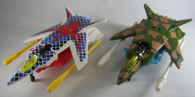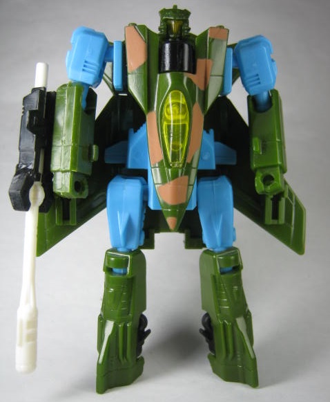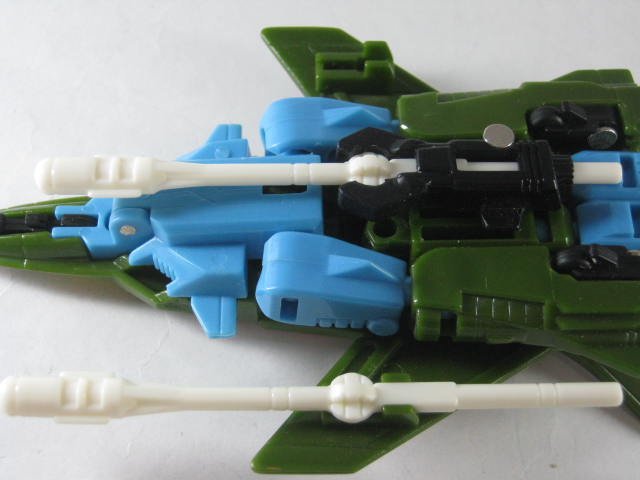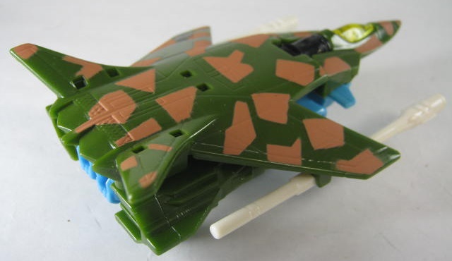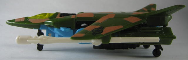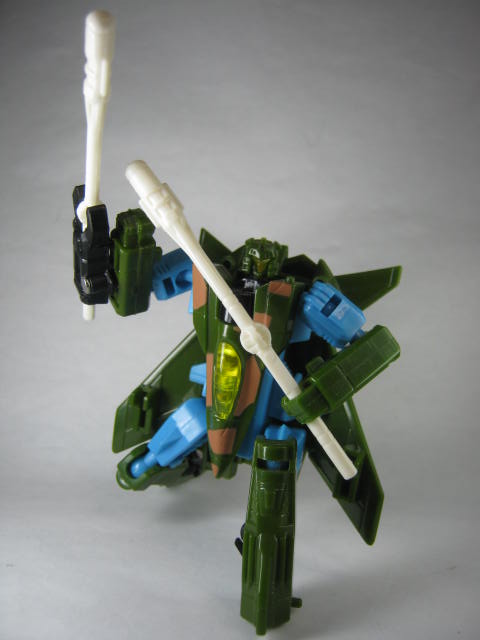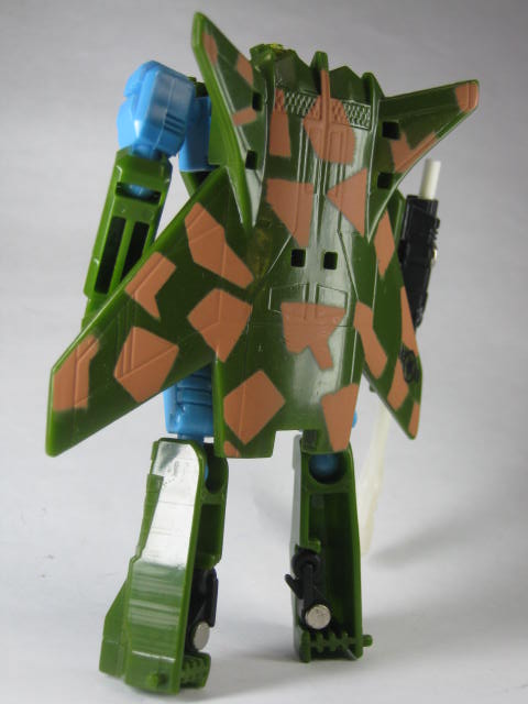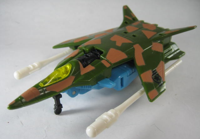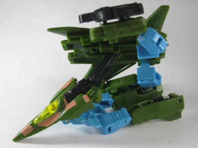 前進翼が特徴的な戦闘機に変形。特別何かモチーフがあるわけでは無さそうですが、前進翼ということでSu-47あたりが比較的近いような?G1ストレイフはSF戦闘機だったので特にこれといった関連性は無し。リペイント元のスペースケースは随分と派手なカラーリングでしたが、こちらはジャングル迷彩風で比較的落ち着いた色合い。水色の関節パーツもギャップがあって面白い。サイバトロンサイバージェットは比較的リアルなカラーをしています。ちなみに他のサイバージェットと違いシール仕様箇所が一切ありません。