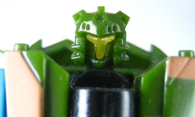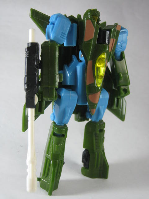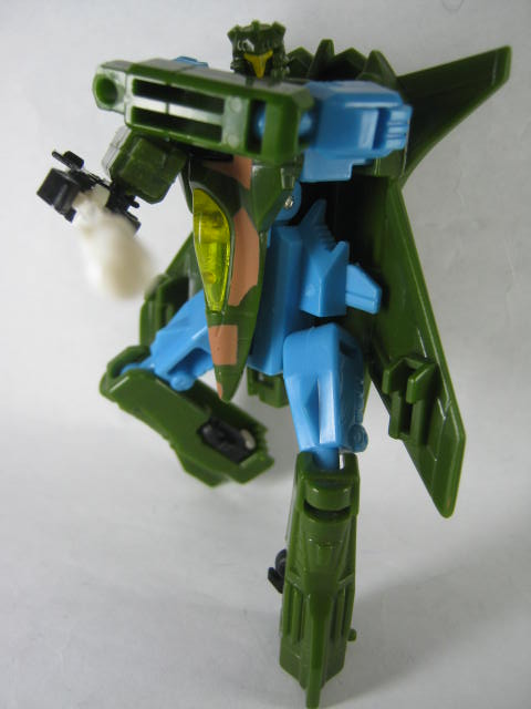 紅白カラーだったG1ストレイフと大きく違い、ダークグリーンと水色という組み合わせが面白い。ダークグリーンを使用しミリタリーチックな雰囲気のTFが好きなのでコイツも好き。リアルカラーに混ざる水色と言うのは実写1作目のオールスパークパワーとかを彷彿とさせますねー。