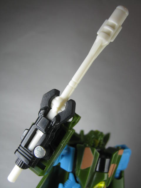 腕にはミサイルランチャーを装備。この型は腕が直接ランチャーになっているのでは無く、肘裏に装備するような形なので拳が残っています。ビークルモードと同様に押し出し式で発射可能。