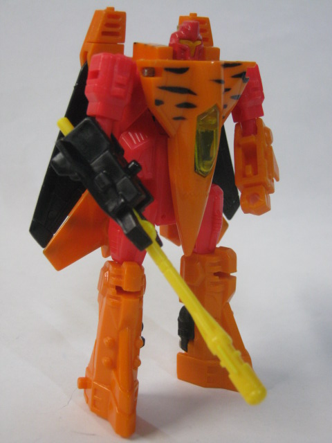 ビークルモードF14風ジェット機に変形。虎柄の模様が目を引きます。着陸脚は収納可能、車輪はダミーです。