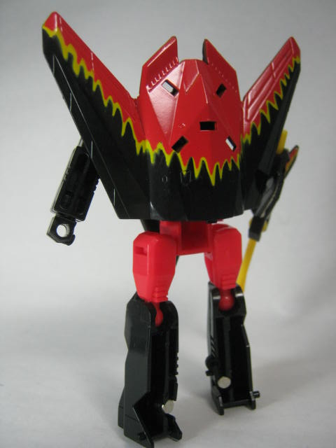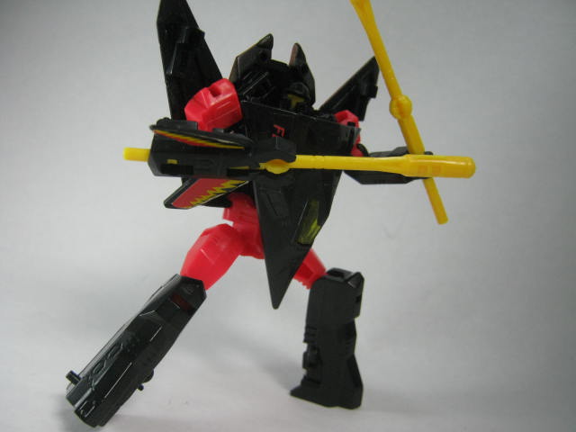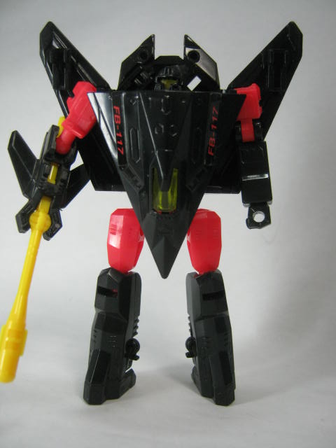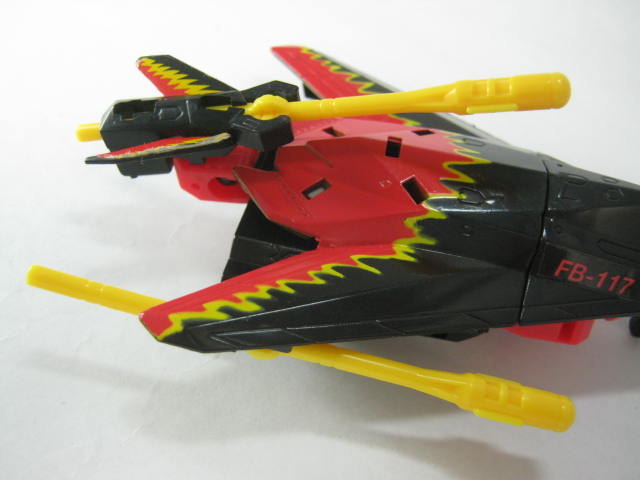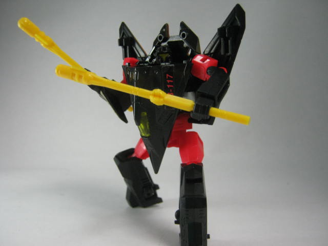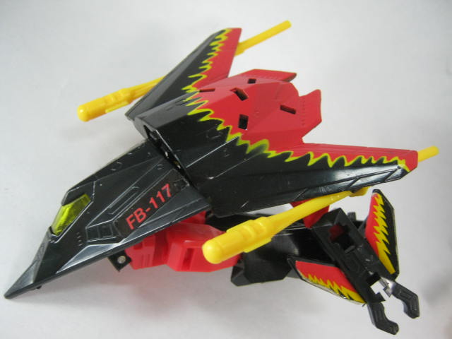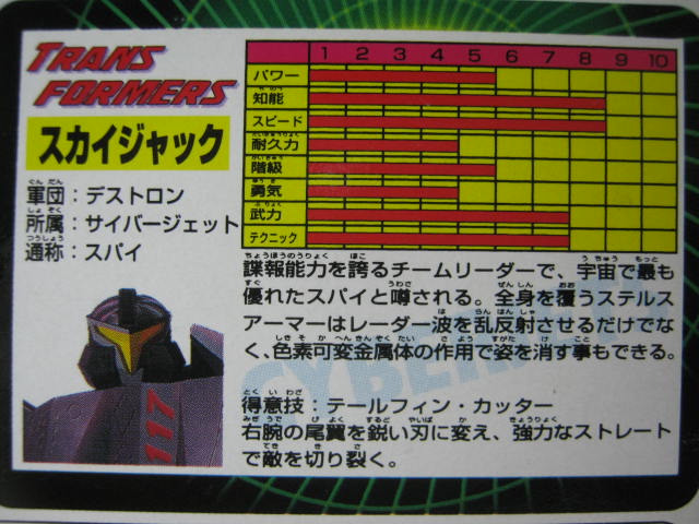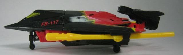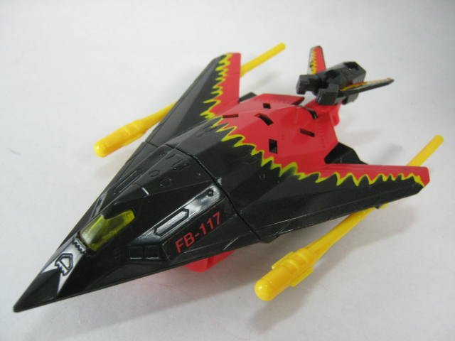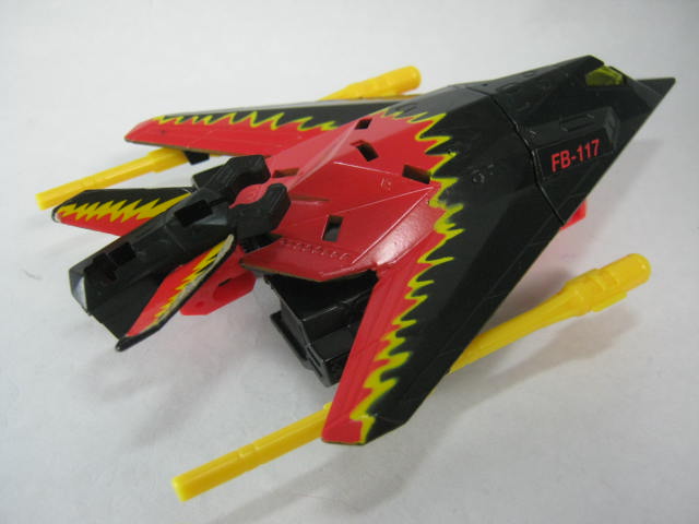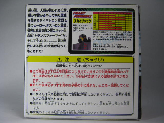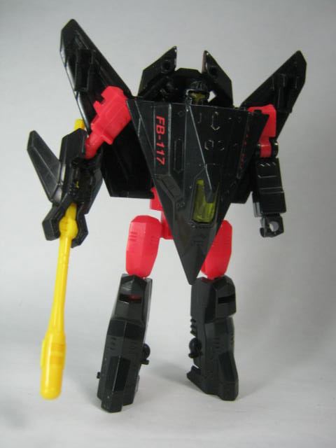 3人のデストロンサイバージェットの内の一人。武器の「ステルスホーミング」はいかなるセンサーにも察知されることなく、ミサイル自身で飛行コースを慎重に選ぶことができ、どんな長距離からでも確実に目標を仕留められる。ステルス機でスパイというビークルと役職が一致している、意外と珍しいパターンだと思います。説明書裏のコミックではセンサーで警戒しながらデストロン基地を探すサイバトロンに、センサーに映らない自分の能力を駆使して奇襲をかけています。
