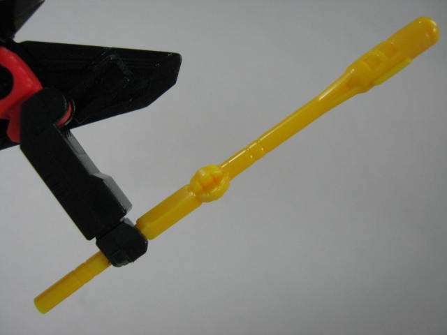 サイバージェット共通のミサイル発射装置は右腕に付いています。ビークルモード時同様に、押し出し式での発射ギミックもそのまま使えます。実は前からスカイジャックは所持していたのですが、ここのシールが欠品でした、つい最近、ジャンクでシール付きを入手出来たので腕だけ交換したモノになっています。得意技の「テールフィン・カッター」はこの右腕の尾翼を鋭い刃に変え、強力なストレートで敵を切り裂く技。パーツの配置を生かした技ってのがG2は多くて面白い。
