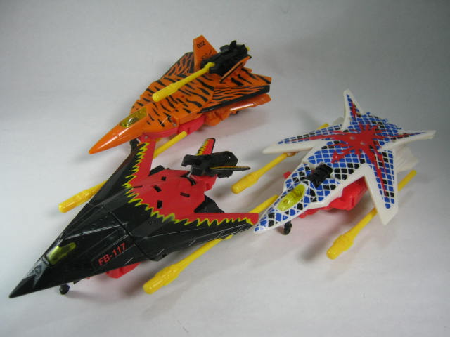 「フーリガン」「スカイジャック」「スペースケース」。サイバージェットは関節、クリアパーツ、ミサイルなどが3体とも共通の成型色で、リペイント版の