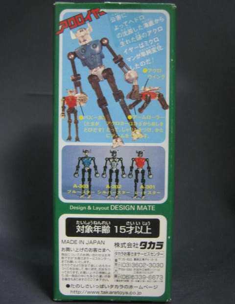 パッケージ今回紹介するのは復刻版。この時期の復刻版のミクロマンは、一部はブリスターパックで売るなど、パッケージが当時品とは異なることもありましたが、アクロイヤーはかなり当時品に近いパッケージでの販売になりました。雰囲気はほぼ当時品のままですが、復刻版を表す文字やタカラのロゴ、裏面の注意書きなどが変更されています。