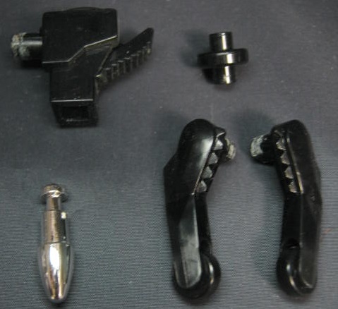 バズーガA、アームローラー、車輪が付属。バズーガAはスプリングでメッキの弾を発射可能なのですが、小さい上に勢いが強いので紛失に注意。予備としてもう一発付属はしますが。