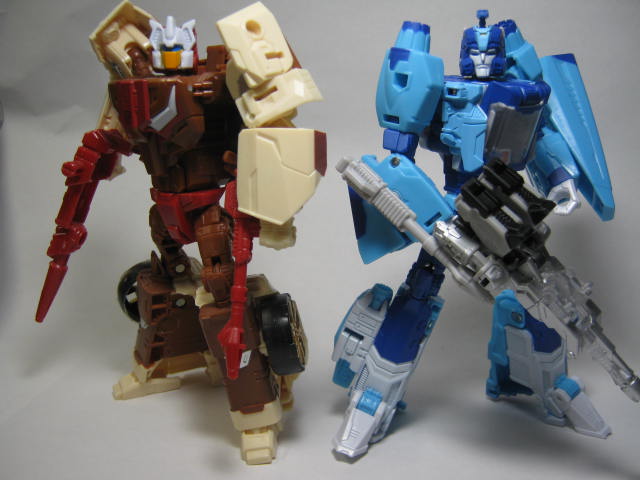 シャフラーもレーザービーストと合体した姿で登場。という訳でシャフラーともヘッドオンさせてみました。シャフラーはオートボットですがなかなか悪そうな顔をしているので良い感じに似合いますね。