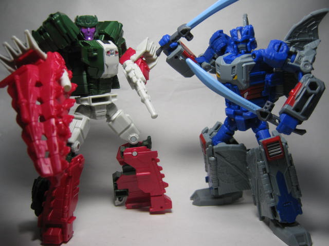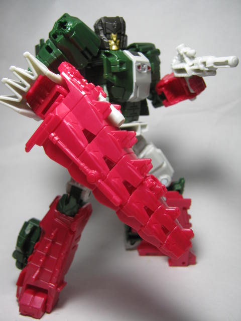 クロスヘッドオン遊びが捗る捗る。タイタンズリターンはコンバイナーウォーズと違い、単体でもヘッドオン遊びが出来る他、低価格でタイタンマスター等頭部のみも販売している分、最低5体は揃えないと合体できなかったコンバイナーと違って少ない数でも楽しめるのが良いですねー。ボディと色合いが近い頭部の方が、やはり入れ替えると似合う気がします。