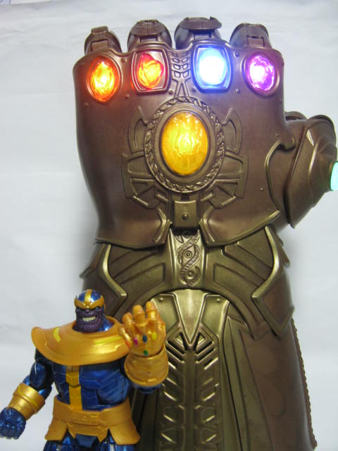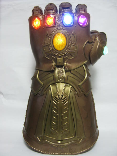 マーベルレジェンドのインフィニティガントレット。インフィニティーウォーのキーアイテム。たぶん実物大。その位大きいです。金の塗装と汚し塗装で質感もそれなりに良いです。実際に腕にはめてレバー操作で指を動かせたり、拳を閉じた状態でロックして飾れたり。サウンド&ライト仕様で遊んでいてとにかく楽しい。6つのストーンもそれぞれ光り、指を動かすか真ん中のマインドストーンを押すと音が鳴ります。そのままで飾っておくのも勿体無いので、専用のケース化何かに入れて飾りたいですねー。なりきり?系のアイテムは滅多に買わないのですが、やっぱり手にすると結構楽しいです。コレはキャプテンの盾とか欲しくなっちゃうなぁ。