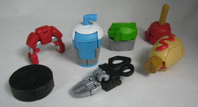 ボットボッツがユニークで面白い!身の回りのモノがトランスフォーマーに!という発想は自体は昔からありましたし、TFの前身であるミクロマンでも大々的に扱っていました。しかし、ボットボッツは食べ物やスポーツ用品、文房具などあまり扱われなかったにまで幅を広げたのが面白い!1弾の時点で61種と途方に暮れる数ですが、その分変形モチーフがバラエティ豊かで見ていて楽しいです。サイズも小型で柔軟素材、デフォルメデザインなど、タイニーターボチェンジャーとの共通点もちょこちょこあり、気になるシリーズ。チマチマつまんで行こうかなーと。