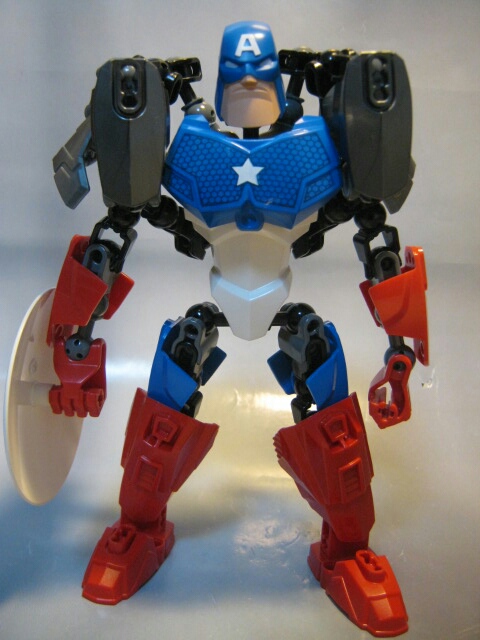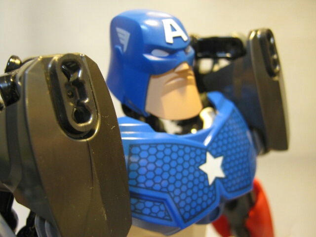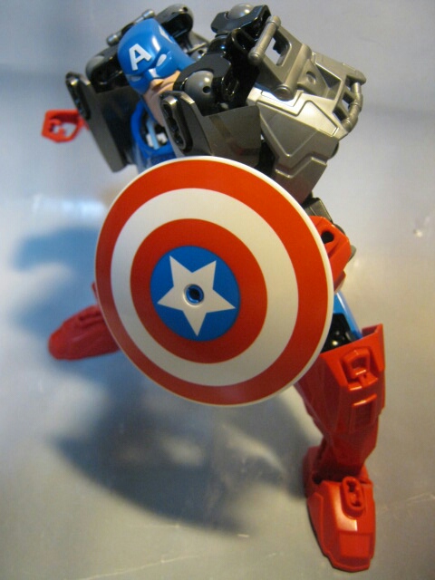 特殊なパーツを使っておきながらも、ちゃんとキャプテンアメリカに見えますね。フレームパーツを組み合わせて作られた肩アーマーのおかげでかなりマッシヴな印象。脚にも追加アーマーを使う事で足首周りのデザインも上手く再現出来ています。