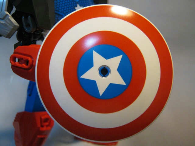 どんな攻撃も防ぐ事が出来るキャプテンアメリカの唯一の武器。フリスビーの様に投げたり、側面で殴り付けたり使い方は様々。真ん中のペグ穴が目立ちますね。白のペグシャフトを使えば目立たなくなるかもしれませんがアレはバーラックツインズにしか入って無かった様な。