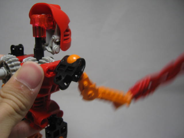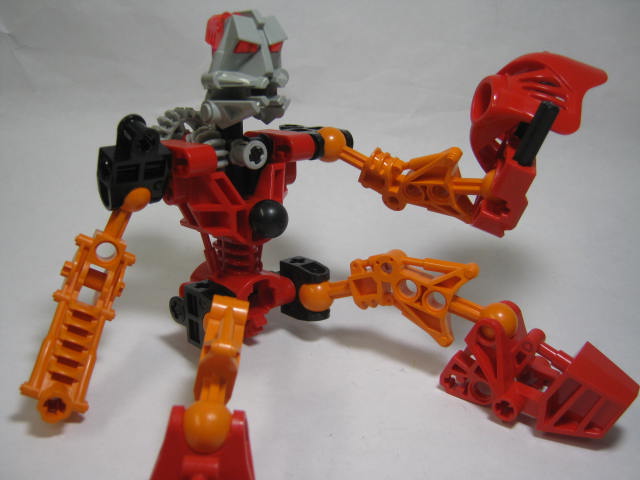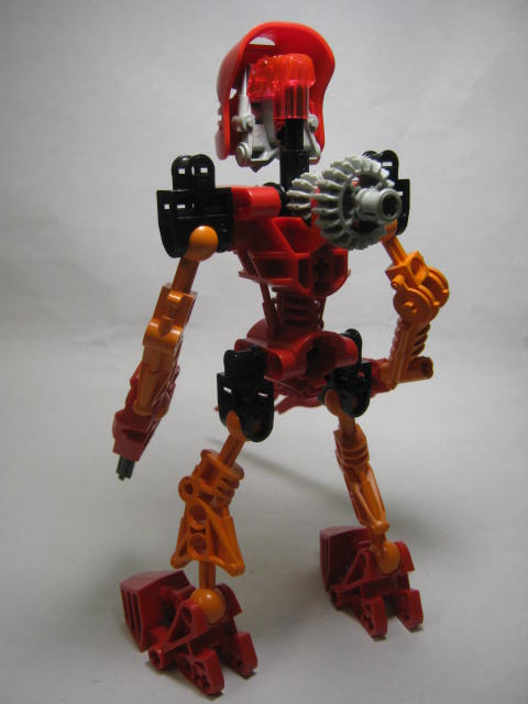 「・マタ」が付くのは後からだったりします。やや頭が大き目ですが、プロポーションはそこそこ良く、どの角度から見ても特に問題はありません。カラーも赤とオレンジをメインにシンプルで良い感じ。通常のレゴやヒーローファクトリー等と比べて、バイオニクルはパーツのモールドが多いのが特徴で、ほぼ全てのパーツにシリンダー等のメカニカルな造型をしています。左右非対称のデザインも面白く、右腕の剣が特徴。左手には2本のシャフトが生えていますが、2003年に発売したゲームを見た感じ、こういう指としてデザインされている模様。