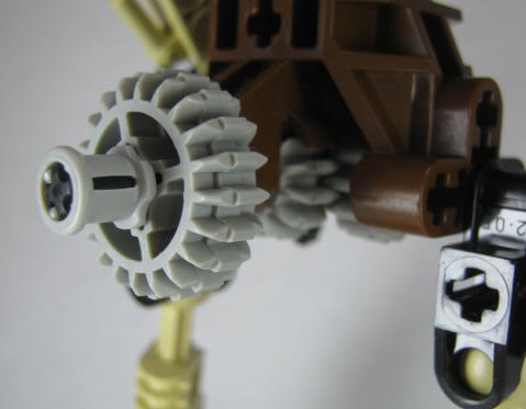 背中のレバーを回せばギアが連動して右脚が前後にスイング!キックギミックを楽しめます。先ほど紹介した付属の岩を蹴って転がすことも可能。蹴り上げると片足になるので自立出来ません。持って支える前提のギミックというのも珍しい。