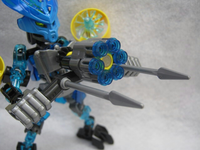 「エレメンタルトルペードーブラスター」は両手で保持する武器。左右にモリが付いています。後部のギアを回せば中央のポッチがビシビシと発射されます。