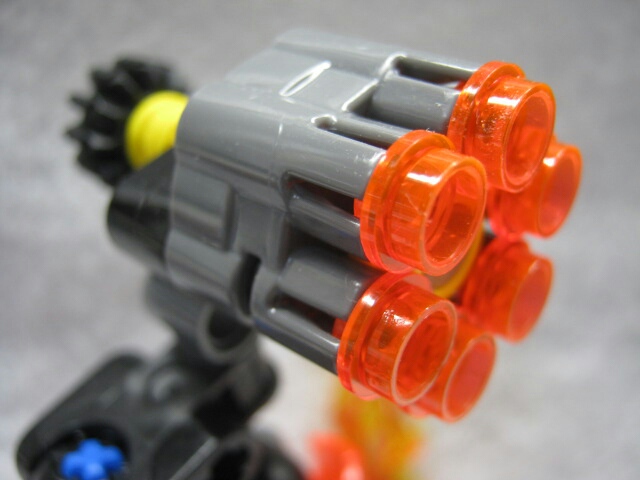 「エレメンタルファイアーブラスター」は肩に装備。貫通ボールジョイントが使われているので自由に角度を変えられます。ギアを回せば中央のポッチがビシビシと発射。
