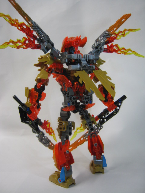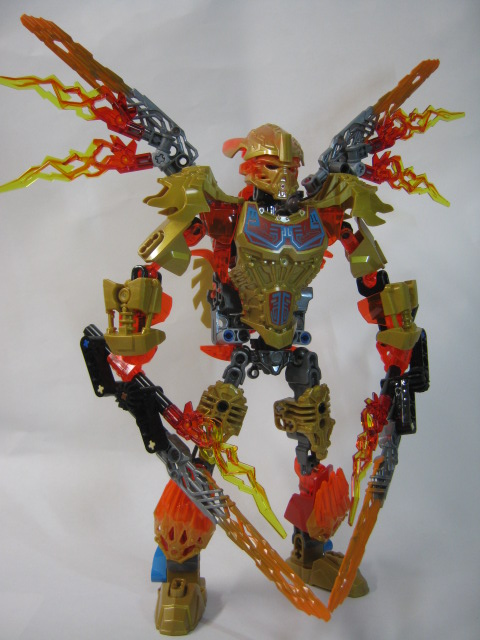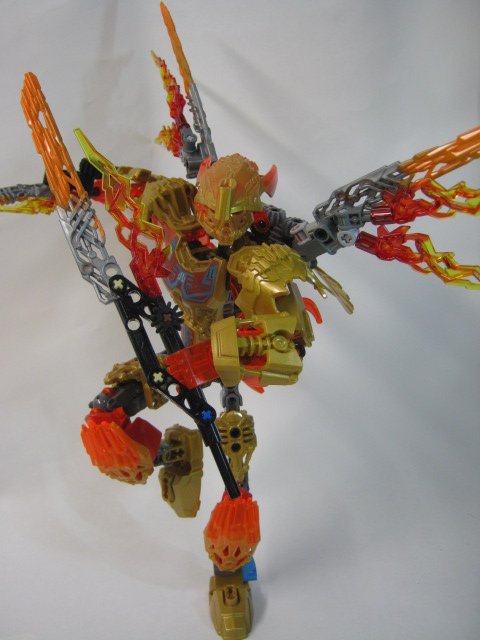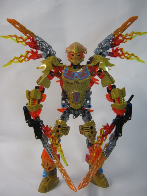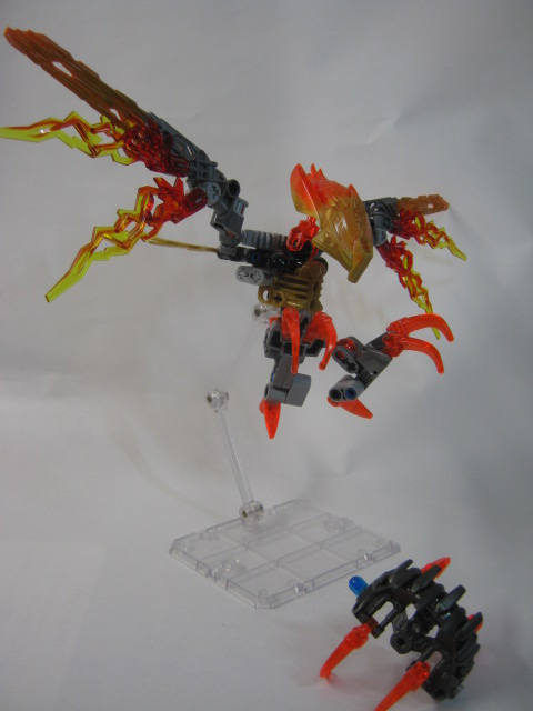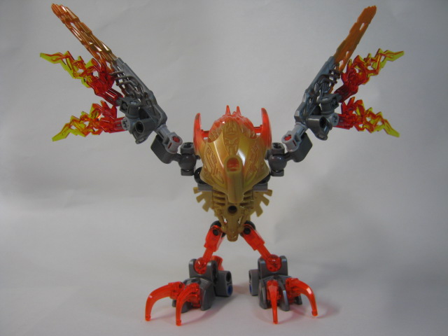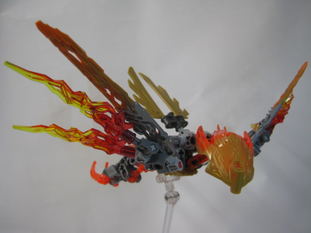 イキルの胸のジョイントを合わせ、クリーチャーの頭部をマスクに被せて合体完了!イキルの大きな羽でシルエットが大きく変わるのが良い感じです。マスクは金にするのがデフォルト。腰と翼のギミックはそのまま生きていますがマスクを弾き飛ばすギミックは使えません。